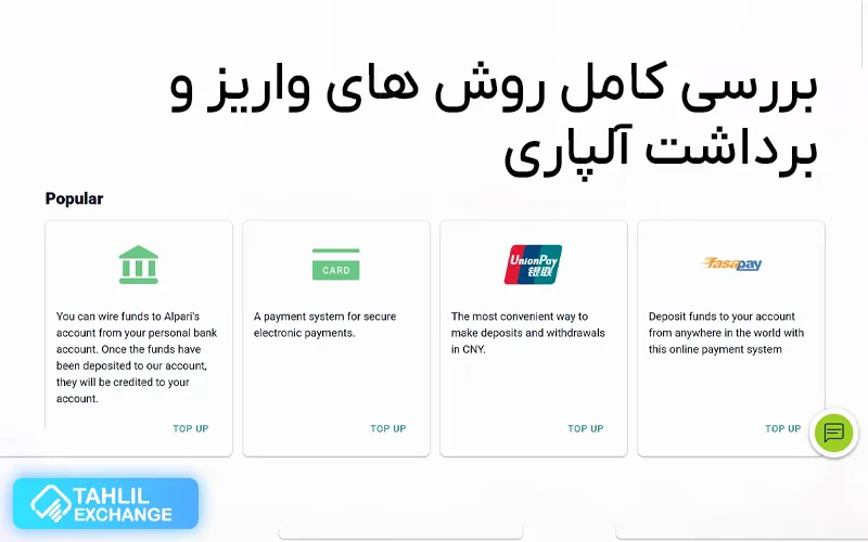 در معاملات فارکس، داشتن روشهای مطمئن و سریع برای واریز و برداشت از حساب آلپاری یکی از نیازهای اساسی معامله گران است. بروکر آلپاری به عنوان یکی از قدیمی ترین و معتبرترین کارگزاریهای فارکس، روشهای مختلفی را برای انتقال مالی ارائه میدهد.