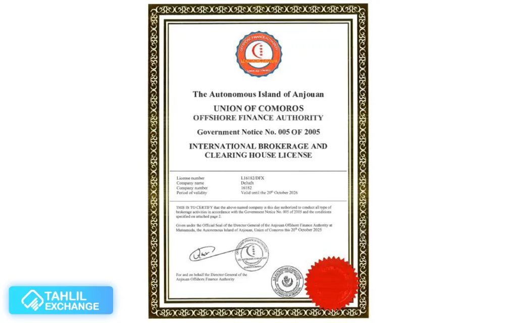 بروکر دلتا اف ایکس در ابتدا در کشور سنت وینسنت به ثبت رسیده بود، اما در حال حاضر ثبت حقوقی آن به سنت لوسیا منتقل شده است. این کارگزاری از نیمه دوم سال 2025 موفق به دریافت رگولاتوری رسمی از Finance Authority (FA) در جزیره خودمختار آنژوان (The Autonomous Island of Anjouan) که یکی از اعضای اتحادیه کوموروس محسوب می شود، شده است. مجوز فعالیت DeltaFX با شماره لایسنس L16182/DFX صادر شده و به عنوان چارچوب قانونی فعالیت این بروکر مورد استفاده قرار می گیرد.