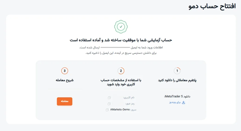 یک حساب دمو با مشخصات فنی که به آن نیاز دارید را تنظیم کرده، پلتفرم را انتخاب کنید و روی دکمه “افتتاح حساب” بزنید.