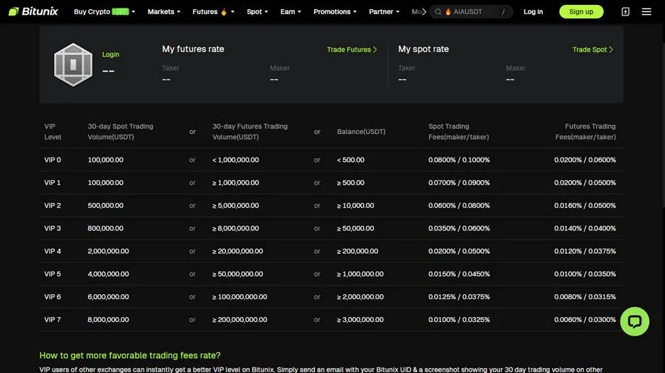 کارمزد معاملات اسپات در این صرافی بر اساس حجم معاملاتی است که در 30 روز گذشته داشته اید محاسبه می شود. این بدان معناست که به ازای هر معامله قرار نیست که از شما کارمزدی دریافت شود. صرافی Bitunix در معاملات اسپات به ازای سفارشات میکر 0.08 درصد و به ازای سفارشات تیکر 0.1 درصد از حجم معاملات 30 روز گذشته را به عنوان کارمزد محاسبه و دریافت خواهد نمود.