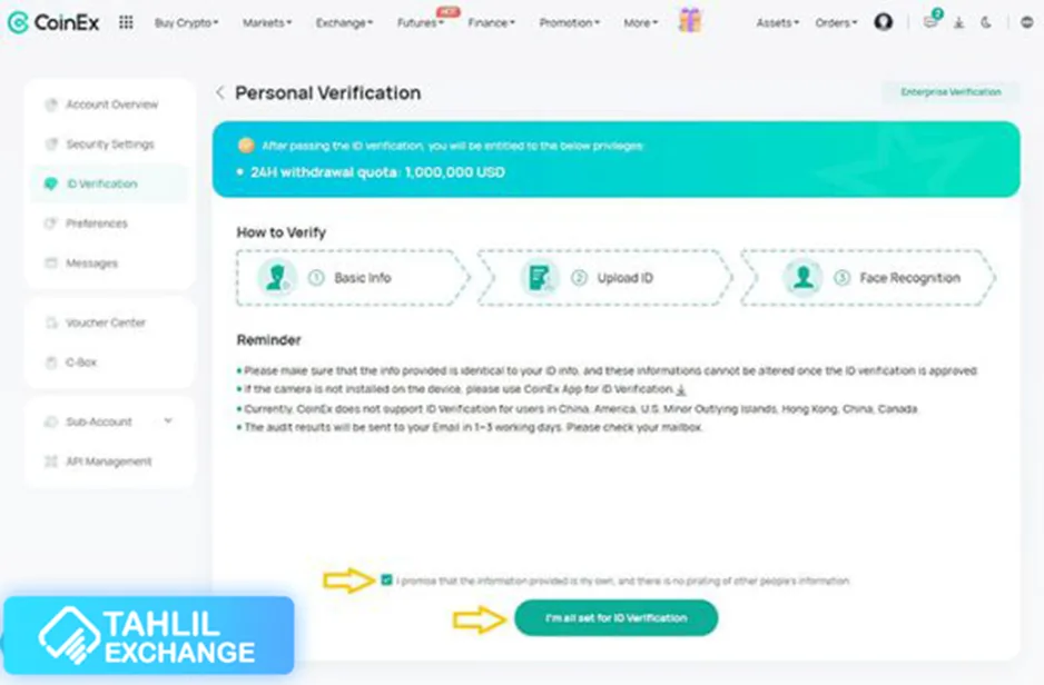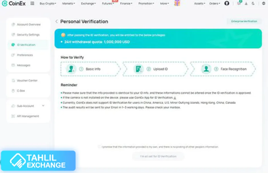 با توجه به آن که برای استفاده از امکانات بیشتر، برداشت های مالی سنگین تر و دیگر مزایای این صرافی، به نحوی نیاز به احراز هویت صرافی کوینکس وجود دارد. صرافی های سر تا سر دنیا این امر را برای جلوگیری از جرائم مالی همچون کلاه برداری، پولشویی، فرار مالیاتی و همچنین افزایش امنیت حساب کاربری و دارایی کاربران خود الزامی می دانند. لازم به ذکر است که در صرافی CoinEX شما می توانید بدون نیاز به احراز هویت نیز به انجام فعالیت و معامله بپردازید اما بی شک فعالیت های شما دچار محدودیت هایی خواهد شد. بعد از ثبت نام و ورود به حساب کاربری خود می توانید فرایند و پروسهاحراز هویت در صرافی کوینکس را طبق مراحل زیر طی کنید.